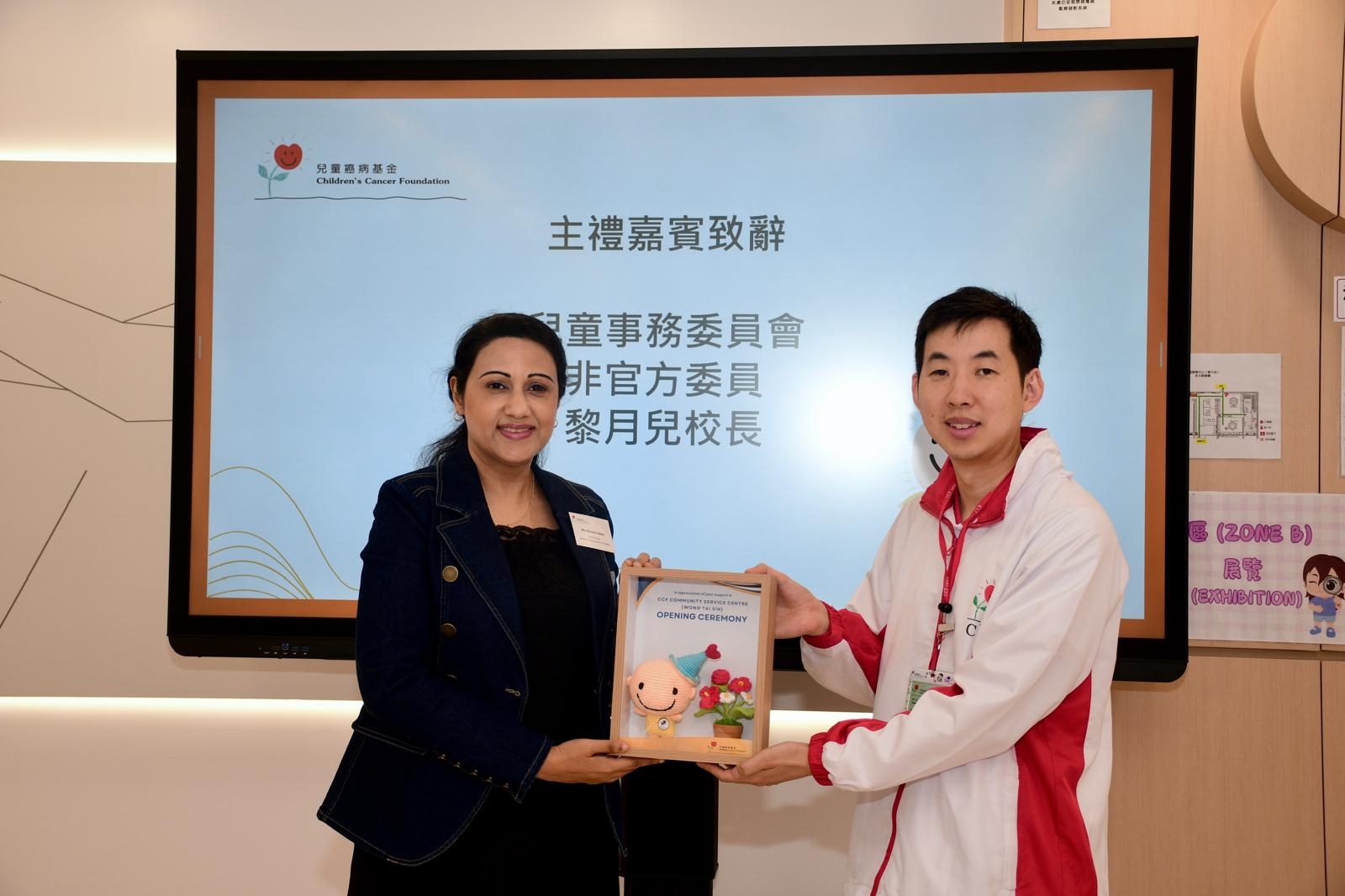 兒童癌病基金副主席林子右先生代表向主禮嘉賓──兒童事務委員會非官方委員黎月兒校長致送紀念品