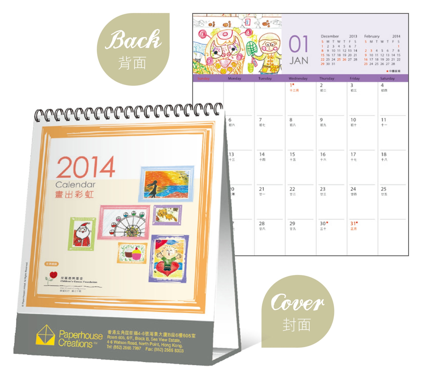 紙藝軒為兒童癌病基金推出2014年座檯月曆,並將售出首4,000 個座檯月曆之款項,不扣除成本,全數撥捐兒童癌病基金(其餘每售出一個撥捐 $8.5)。月曆內的每月插圖均為兒童癌病基金的病童繪製。 |