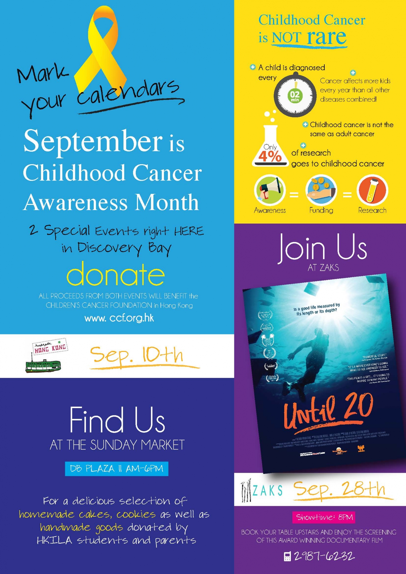 九月為兒童癌病關注月。Hannah’s Heroes九月份於愉景灣舉辦兩項慈善籌款活動,目的為提高兒童癌症的關注及為香港兒童癌症研究籌款。兩項活動收益將全數捐予兒童癌病基金。請多多支持!詳情:1) 手工藝及小食義賣攤位日期:2017年9月10日(星期日)時間:上午11時至下午6時地點:愉景廣場II2) 紀錄片“Until 20”慈善放映會日期:2017年9月28日(星期四)時間:下午8時地點:愉景廣場ZAKS餐廳*請於餐廳上層預訂座位,電話:2987 6232