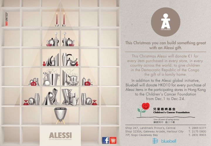 意大利家庭用品品牌Alessi香港專門店,現時正為兒童癌病基金舉辦籌款活動:每售出一件貨品,藍鐘集團即捐出HK$10,支持兒童癌病基金。 |