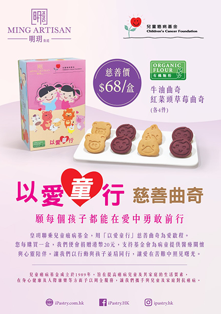 兒童癌病基金再次與皇玥合作,推出「以愛童行」慈善曲奇 (8件裝)。當中部份收益將撥捐兒童癌病基金,為有需要的癌病及危皇病兒童出一份力。