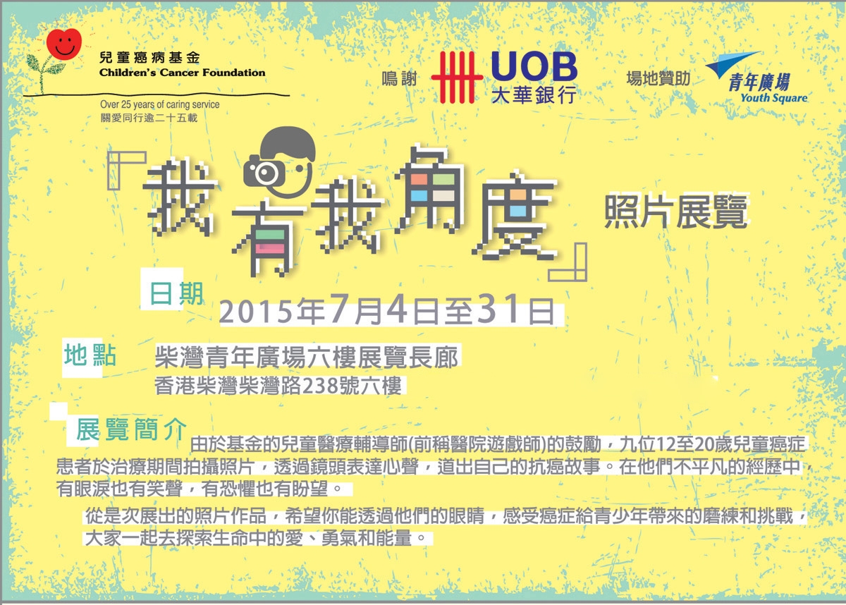 2014年,兒童癌病基金開展了「我有我角度」攝影活動,九位參加的青少年病人,包括Benny、Elaine、Kit、Oscar、Sze Sen、Yin、淚、 嘉鎂及悅悅,在兒童醫療輔導師的協助下拍攝了共160多張照片,並一一為每張照片寫下標題及感受。過程中,兒童醫療輔導師亦被他們所流露的感情觸動,故希望公眾可以藉著展出的照片,一探這九位不平凡青少年人的內心世界。